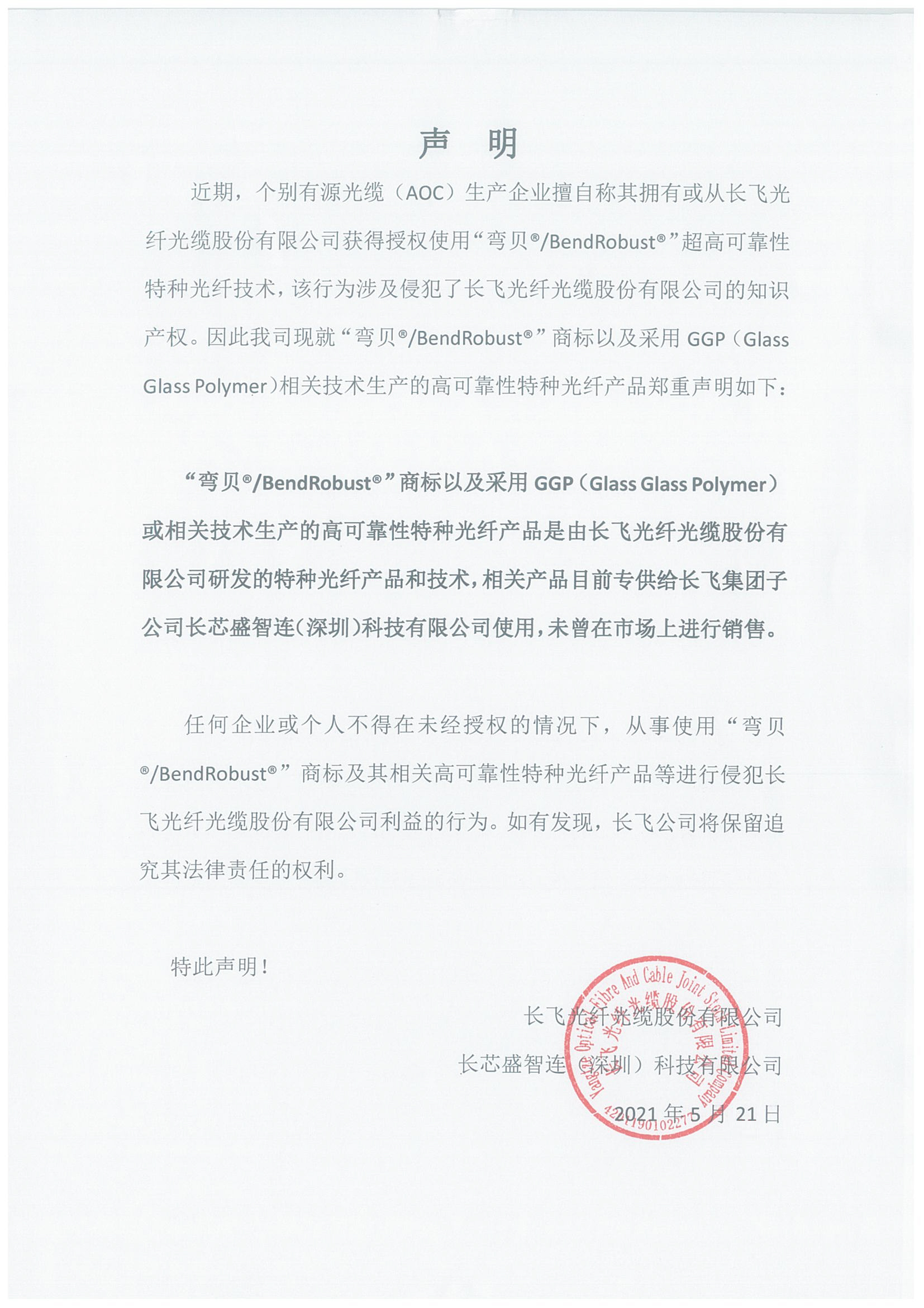 長飛、長芯盛智連關于特種光纖產品技術的聯合聲明