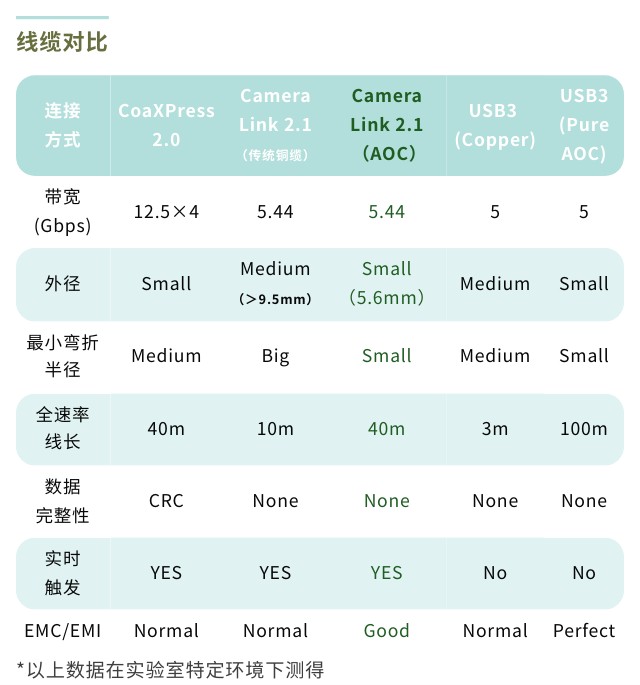 相比之下,傳統的 Camera Link 連接線采用銅作為傳輸介質,容易因頻繁的彎曲和擠壓而斷裂或損壞。抗干擾能力也更差,并且傳輸距離受到限制。