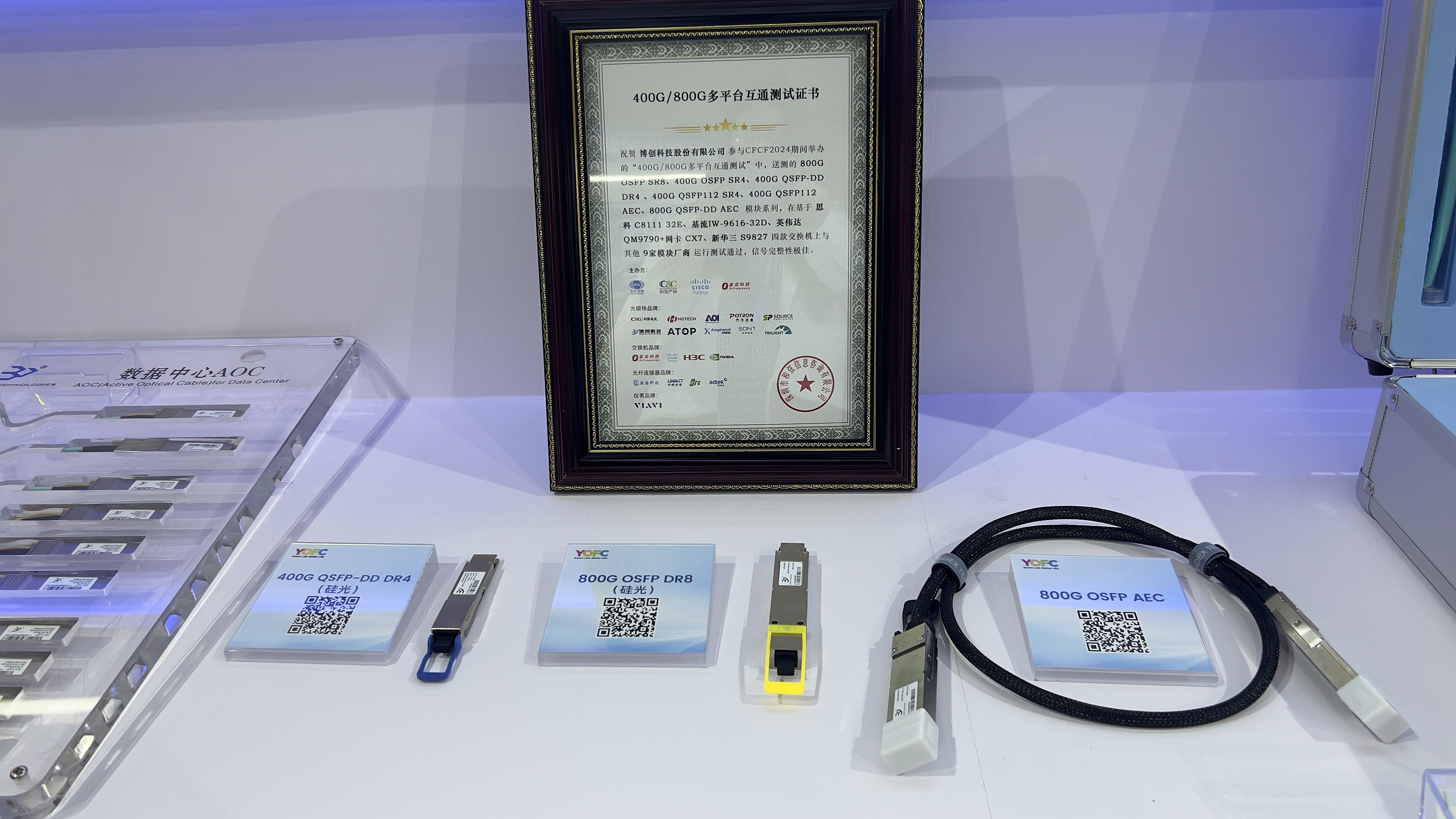 光模塊展區展示了光模塊、有源光纜AOC及直連銅纜DAC系列產品,速率范圍覆蓋10G~800G。其中400G/800G光模塊支持覆蓋OSFP、QSFP-DD和QSFP112等多種封裝形式,用戶可根據具體需求和場景選擇適合的封裝形式。產品成功通過由光纖在線主導發起的“400G/800G高速光模塊互聯互通測試”,與行業內其他主要光模塊制造商在不同主流的交換機和網卡設備上實現互聯互通,具備卓越的信號傳輸品質。