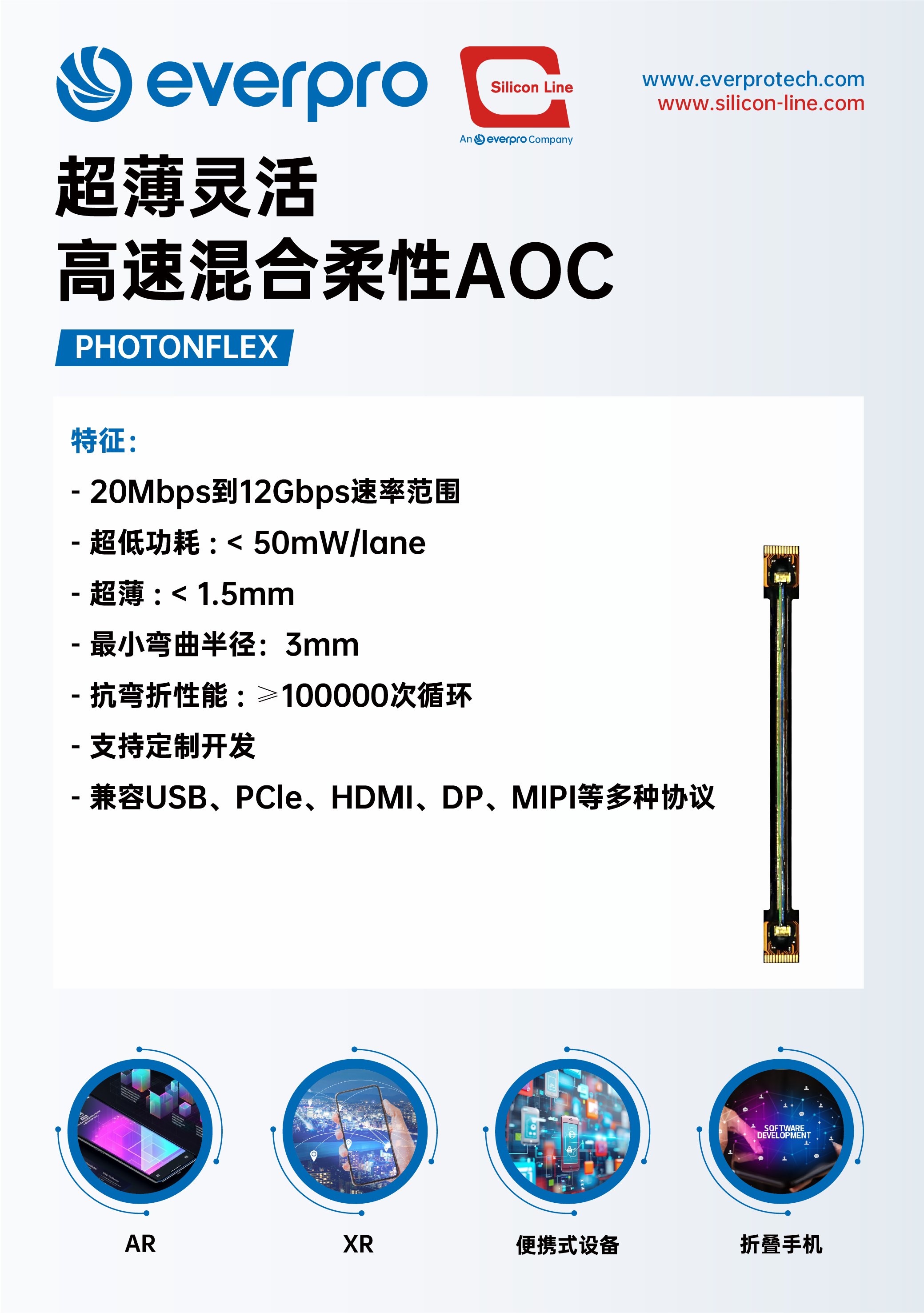 本屆CES,長芯盛全新推出用于AR、XR、折疊手機等領域的高速混合柔性有源光纜方案,更輕薄靈活,支持USB、PCle、HDMI、DP、MIPI等多種協議,滿足多樣化應用需求。