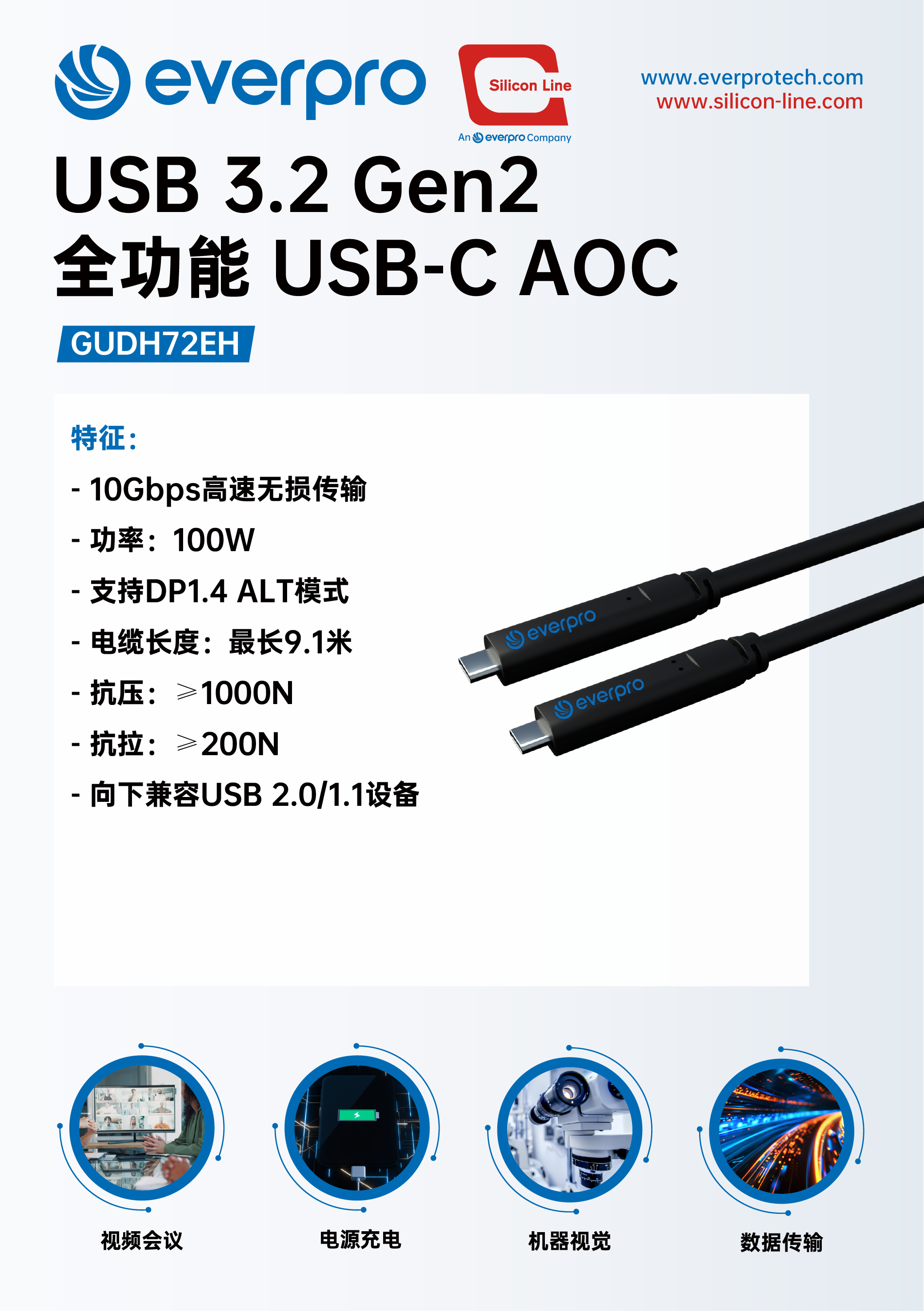 100W USB3.2 Gen2全功能USB-C有源光纜,支持9.1米長距離傳輸,向下兼容USB 2.0/1.1設備,具備超強抗壓抗拉性能,確保穩定可靠的連接體驗。