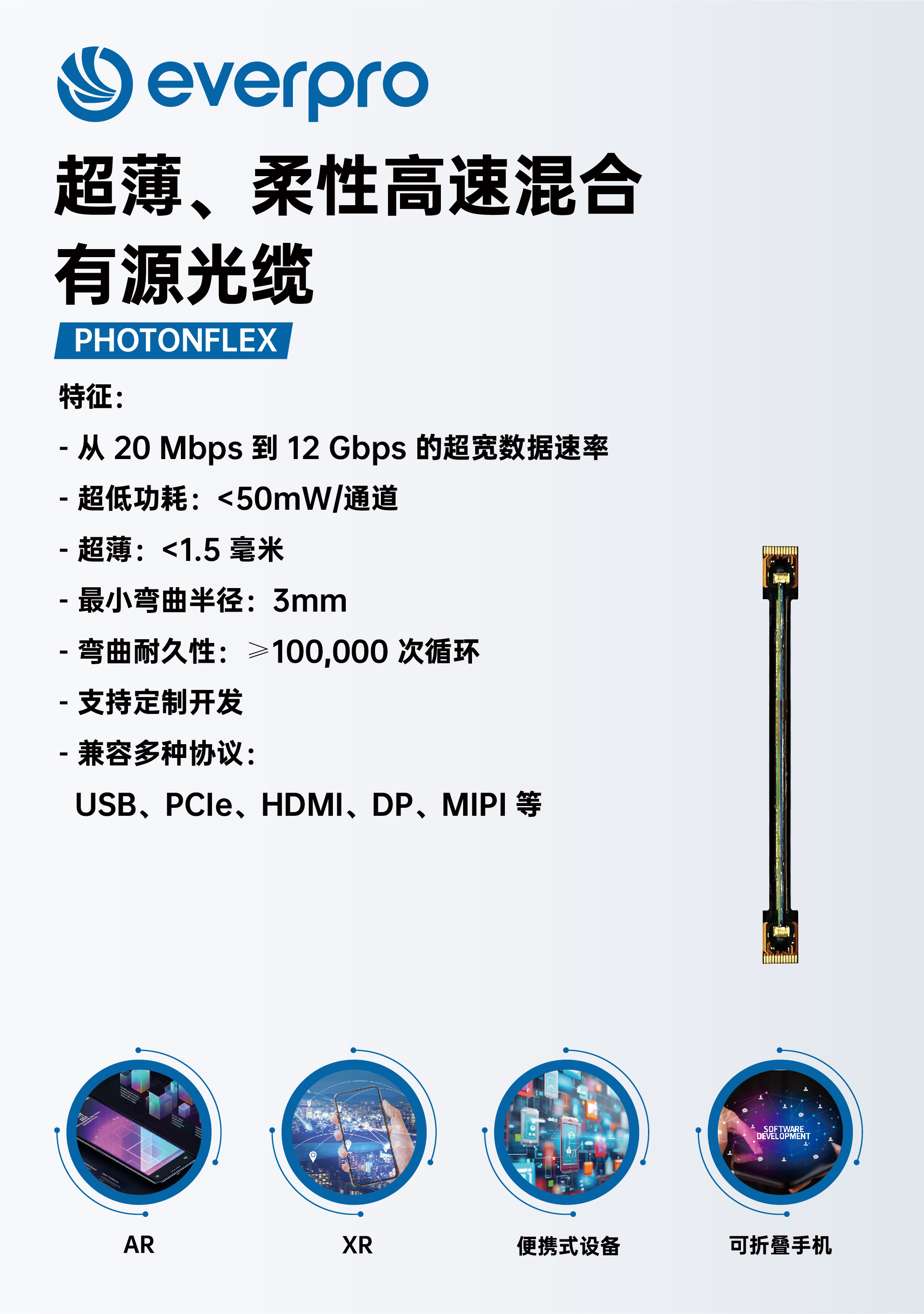 超薄、柔性高速混合有源光纜,支持從20Mbps到12Gbps的超寬數據速率,兼容USB、PCle、HDMI、DP、MIPI等多種協議標準,支持定制化設計開發,滿足不同應用場景需求。