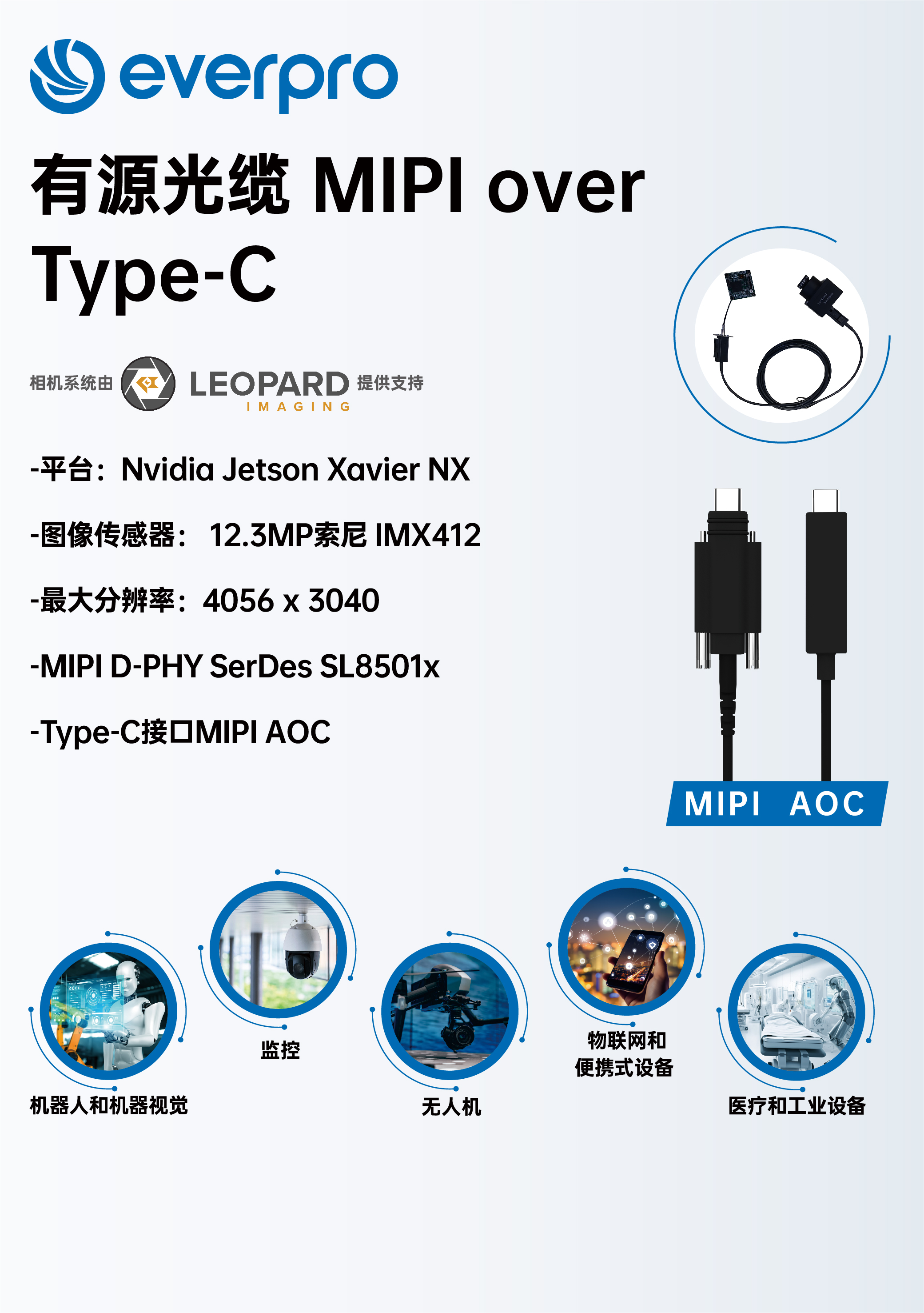 有源光纜 MIPI over Type-C,帶寬達12Gbps,實現20米長距離的數據傳輸,是目前行業內連接距離最長、帶寬最大、穩定性最好的MIPI通信解決方案。